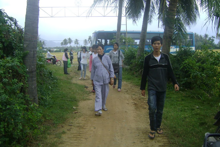 Trước giờ thiền hành, mọi người quây quần bên nhau hát thiền ca và được Thầy giải thích ý nghĩa thiền hành. Đúng là có một cảm giác thật khác khi thực tập ở nơi đây. Đi qua bãi cỏ xanh, bãi cát đá, mỗi bước chân có gì rất lạ lạ, vui vui và bình yên trong lòng.